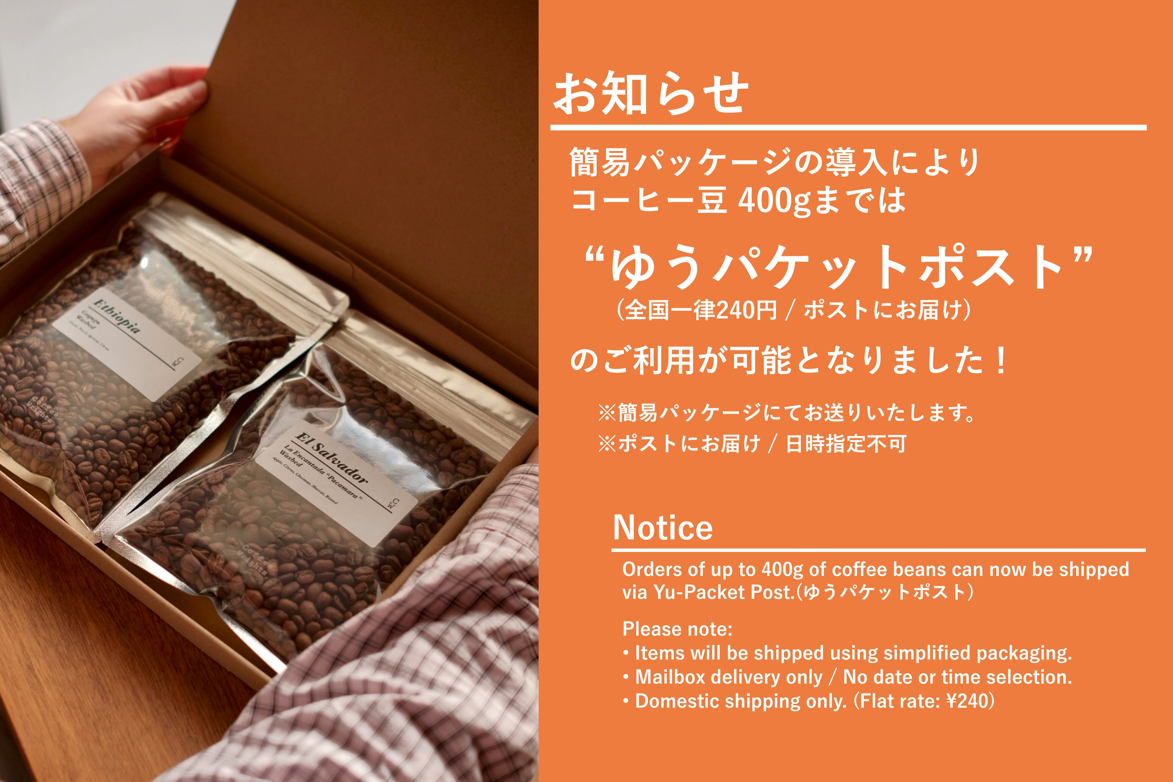 *コーヒー豆、合計400gまでのご注文の際はゆうパケットポストをお選びいただけます。(簡易パッケージ / ポストにお届け / 日時指定不可)